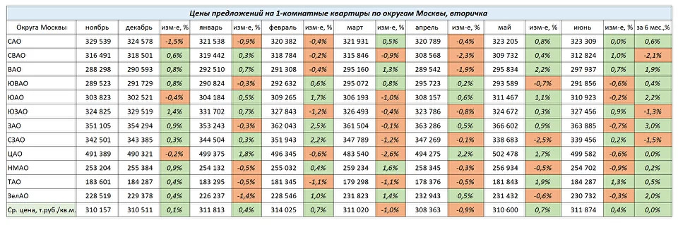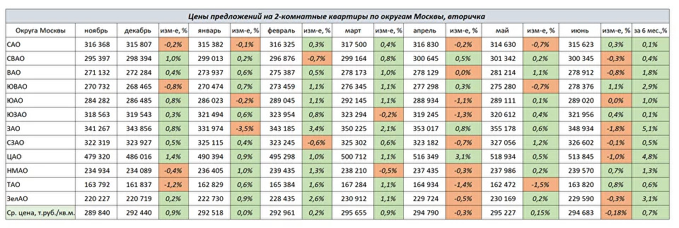 По итогам первого полугодия уровень средних цен предложений по большинству округов в целом не изменился, наблюдался лишь символический рост. При этом, наибольший рост показали квартиры на вторичном рынке в Зеленограде, ЮВАО +3% и в ЗАО +3,8%.