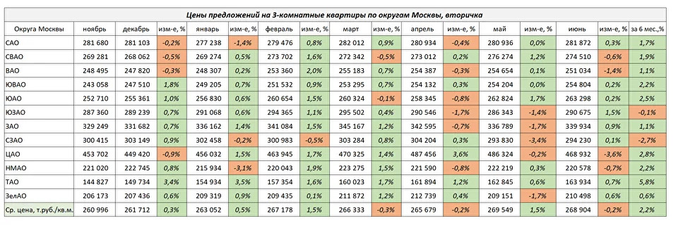 В сегменте 3-комнатных квартир лидером роста стал ЮЗАО +1,5%. Снизились цены в ЦАО -3,6%.